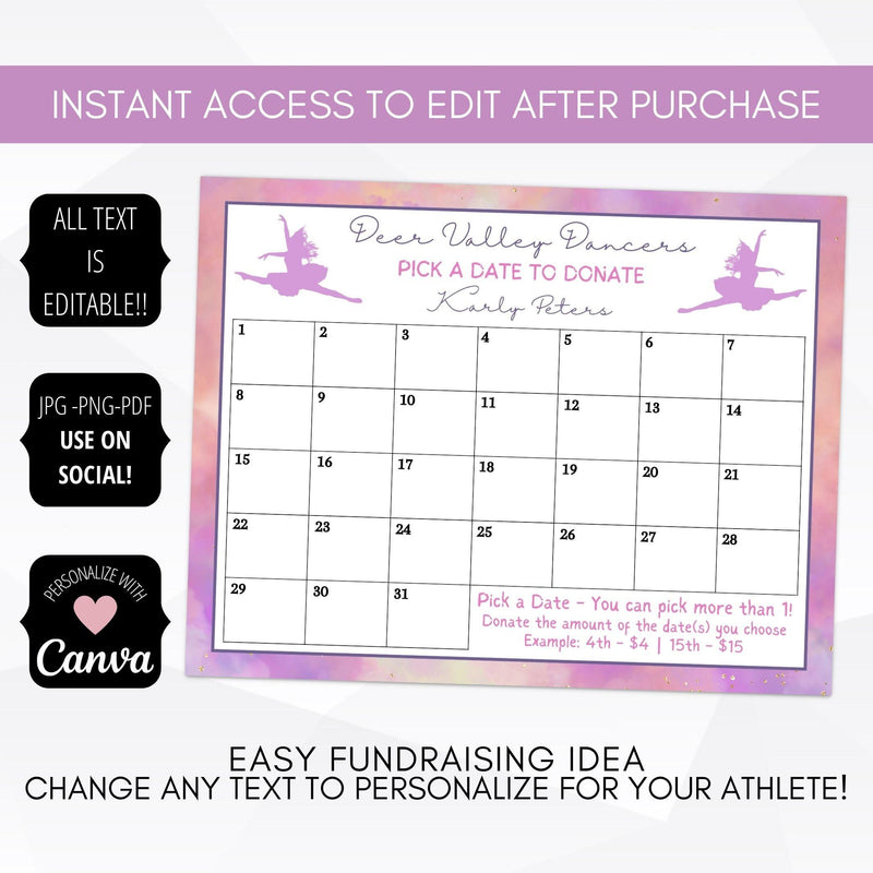 Dance team fundraiser calendar template. Creative ideas for dance calendar fundraisers. Check out our dance pick a date to donate.