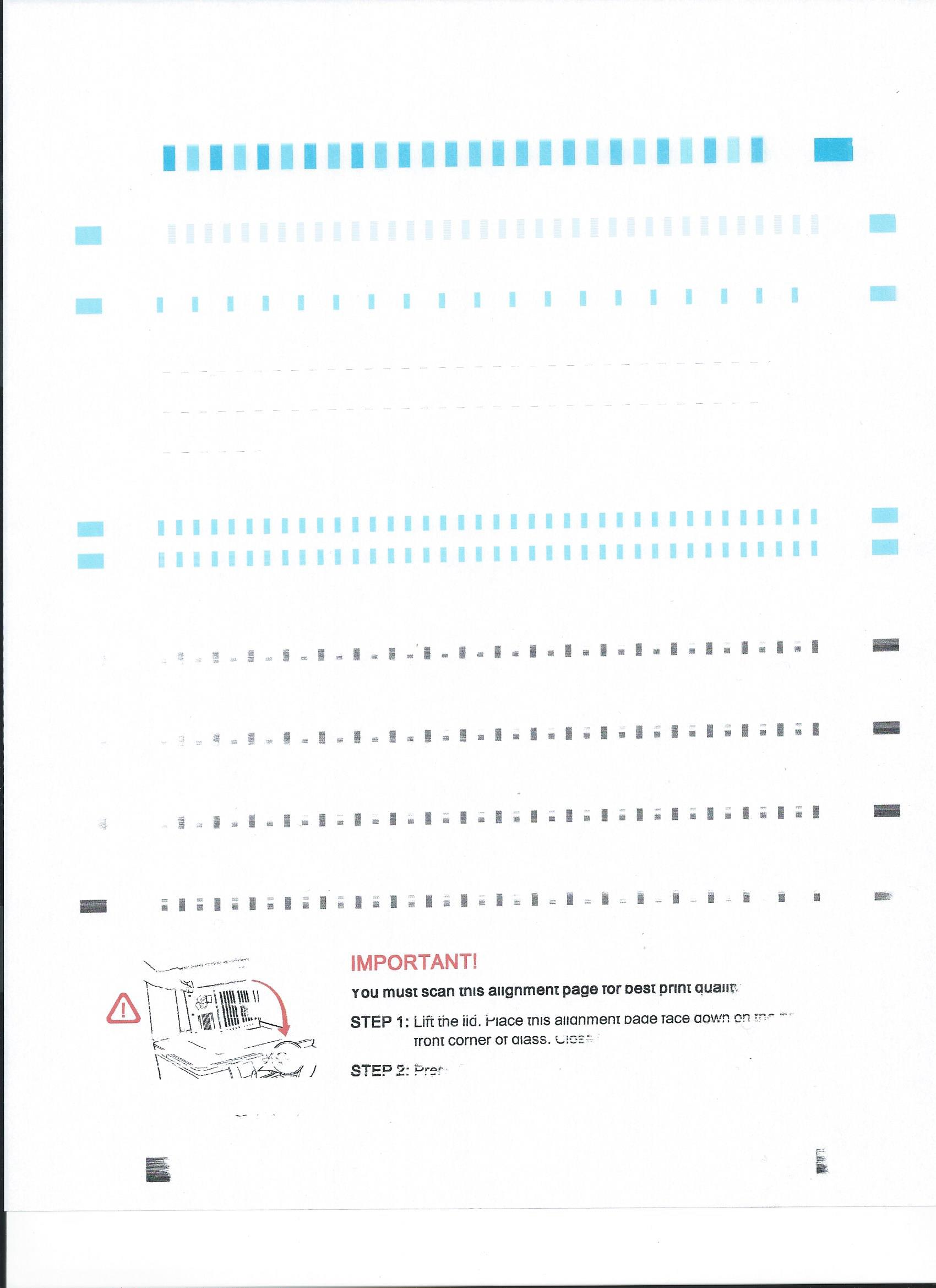 Load plain white paper into the tray. Wait for the alignment page to fully eject from the printer. (the printer has already printed out 4 copies of the test alignment page, and i have placed it in the scanner 4 times and pressed copy. But it still keeps printing the test alignment page every. When i turn it on, it.